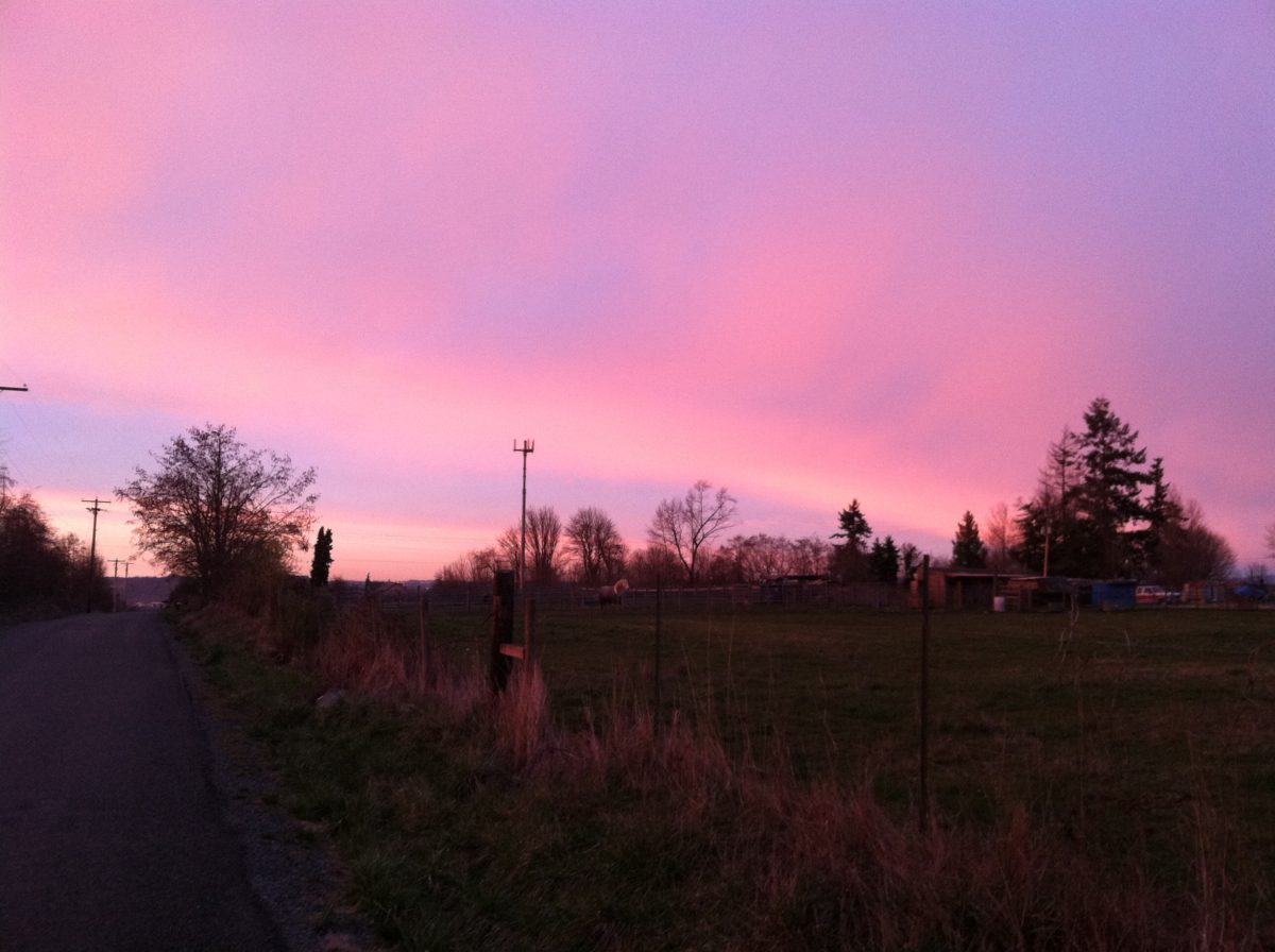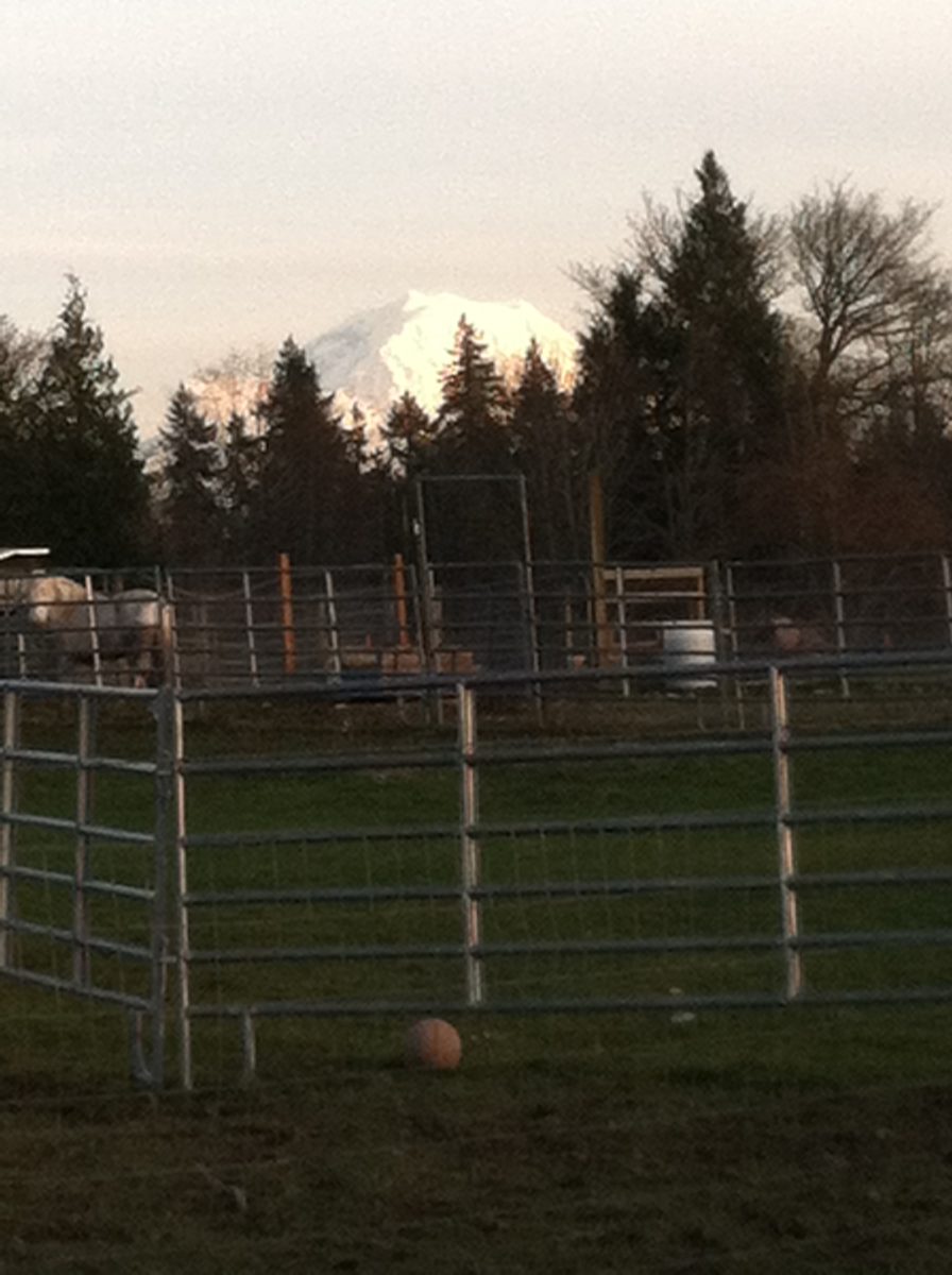 At the north end of the quarter mile I can see into the Port of Tacoma and we often marvel at the container cranes that reach into the sky above. Across the horse pasture and peeking through the trees, we see Mt. Rainier although he avoids a good picture and the images invariably turn out grainy with my phone’s ineffective zoom.The entire road stretches for about a quarter mile, takes a sharp left and dips steeply down to a four lane road with cars zipping past, never knowing the treasures they missed.