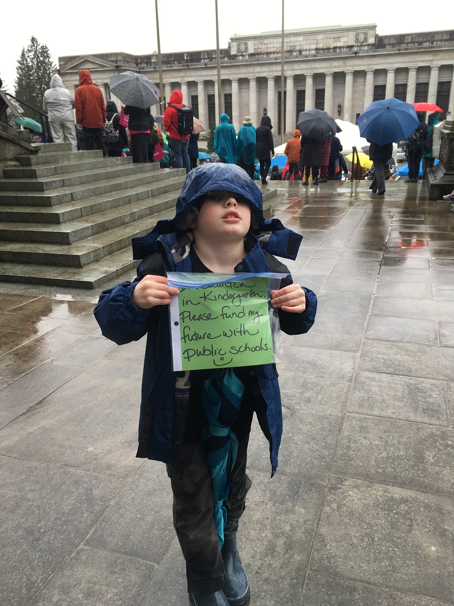 With coffee for the moms and donuts for the shorter people, Billie Jo gave them card stock to draw onto and stickers to add. After they finished, Jo and I wrote messages asking our legislators to fully fund their public education. They have a few years in front of them! Because we live in Western Washington, my friend also packed ziplock bags to keep our words and art dry.