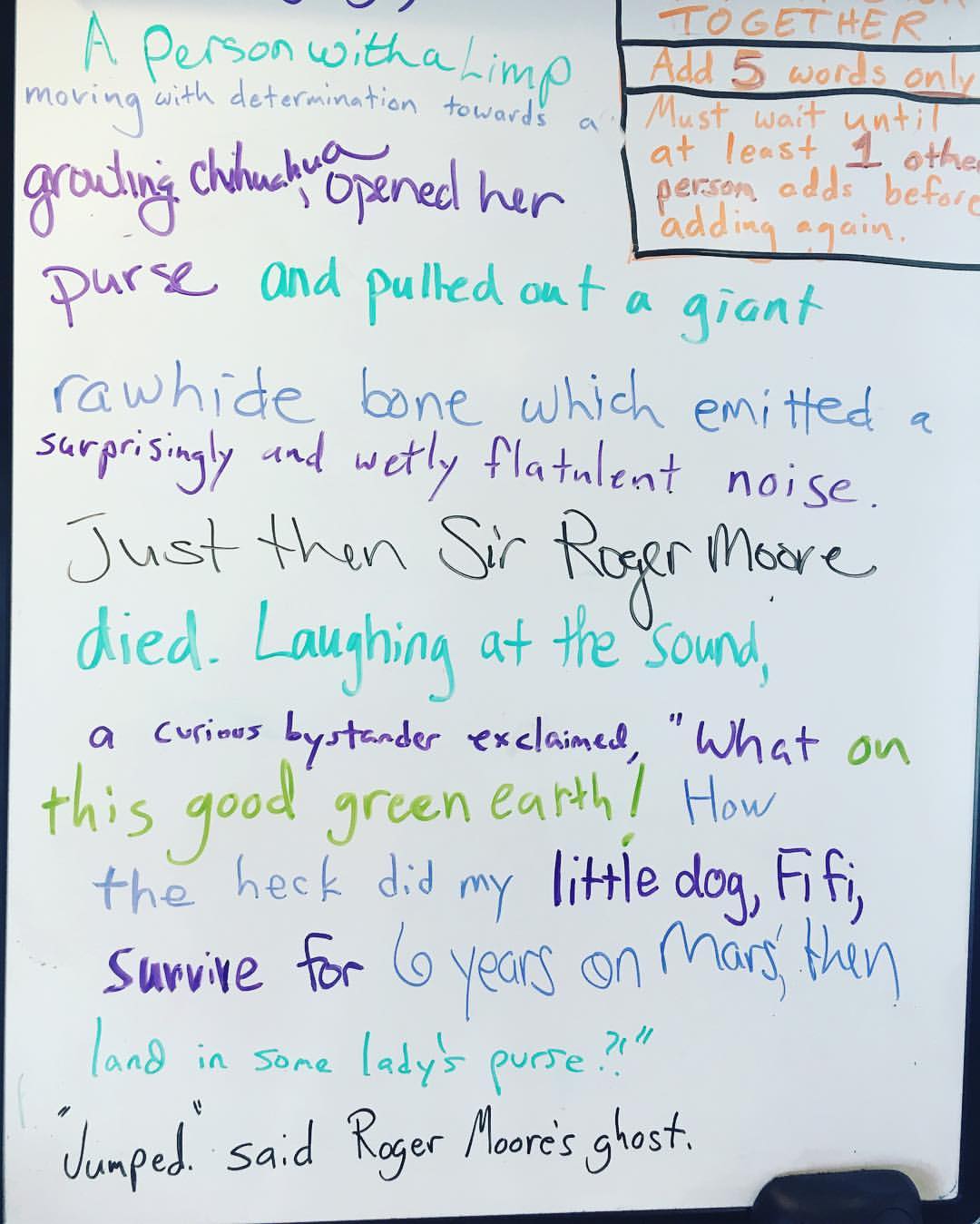 Unless…I get the chance to write haiku and group stories on a white board with my colleagues and friends. A little slog still happens. But, honestly, it becomes something more like making mud pies.