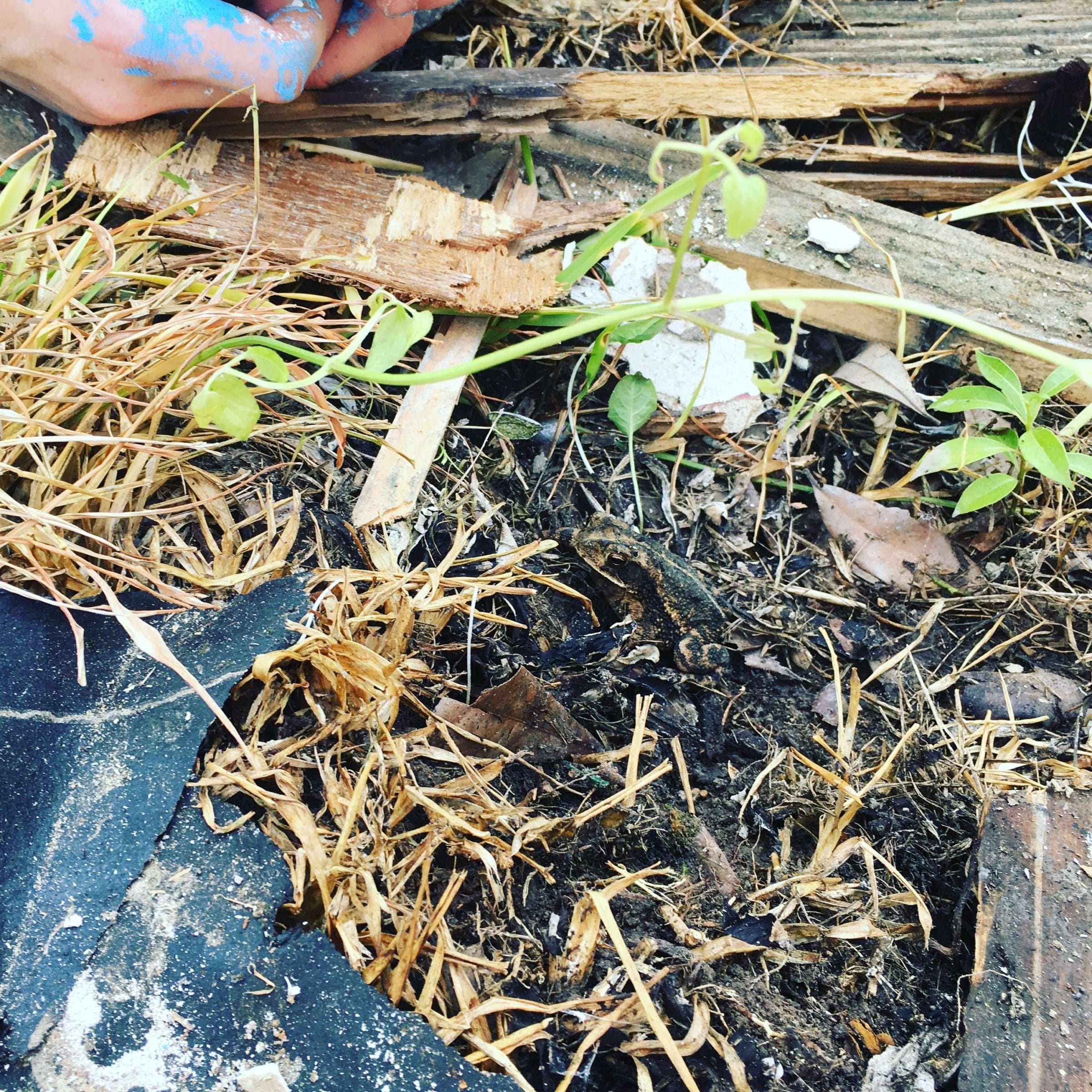 We got back to work then, telling each other stories to help the time pass and, eventually, The Pile was gone. Under all the pieces of sheetrock and torn two-by-fours, we found a frog, still camouflaged and probably annoyed that we had removed his cover.