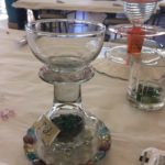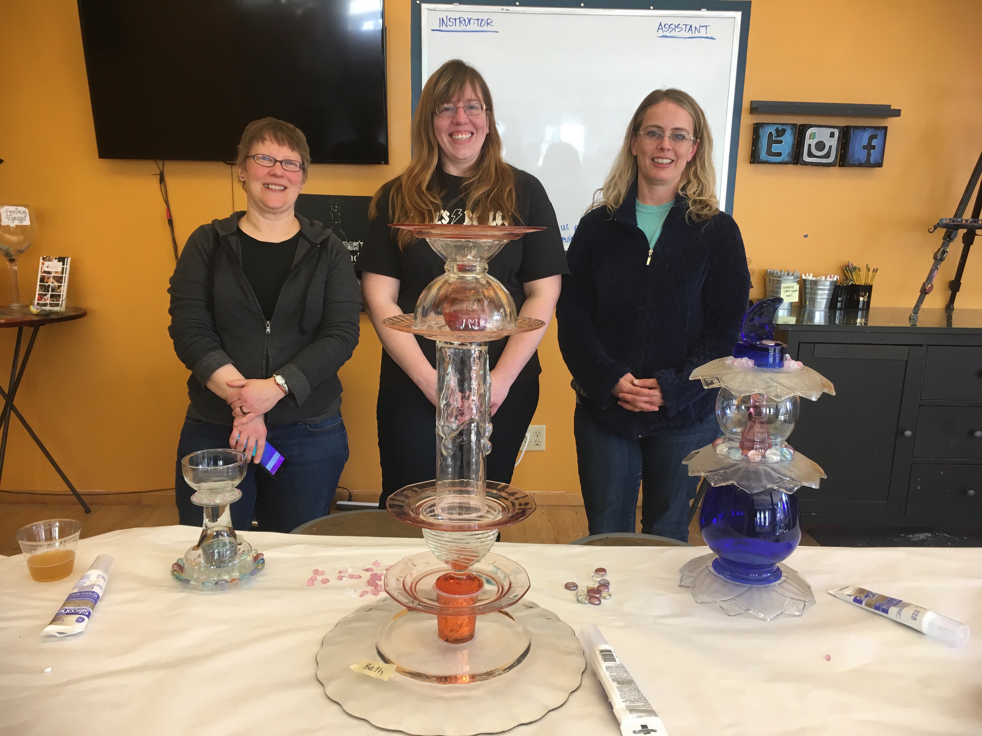 Here’s what we made while sipping wine and beer, laughing, and soaking up each other’s company. Life is good–even if Beth couldn’t quite make that orange glass skull work in her piece.